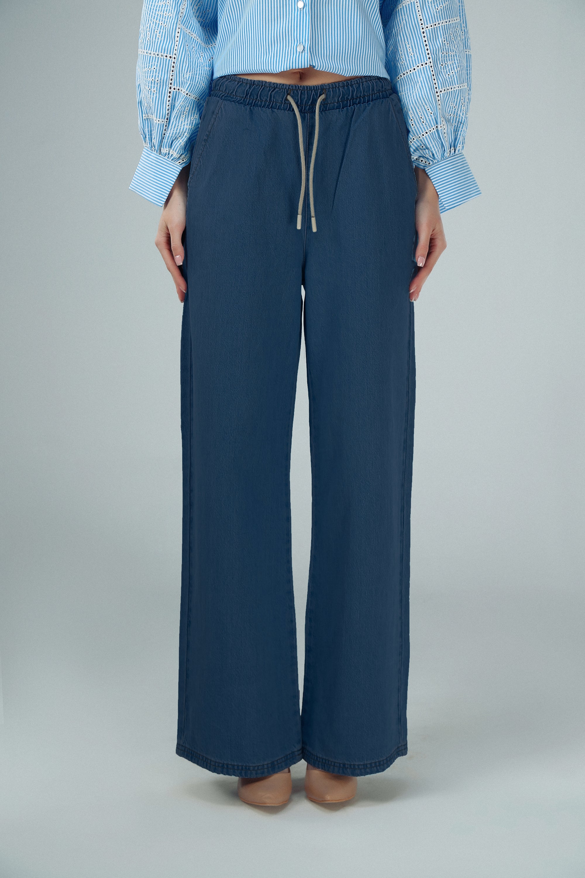 Relaxed-fit denim pants featuring a wide-leg silhouette and adjustable drawstring waistband for effortless comfort and style.