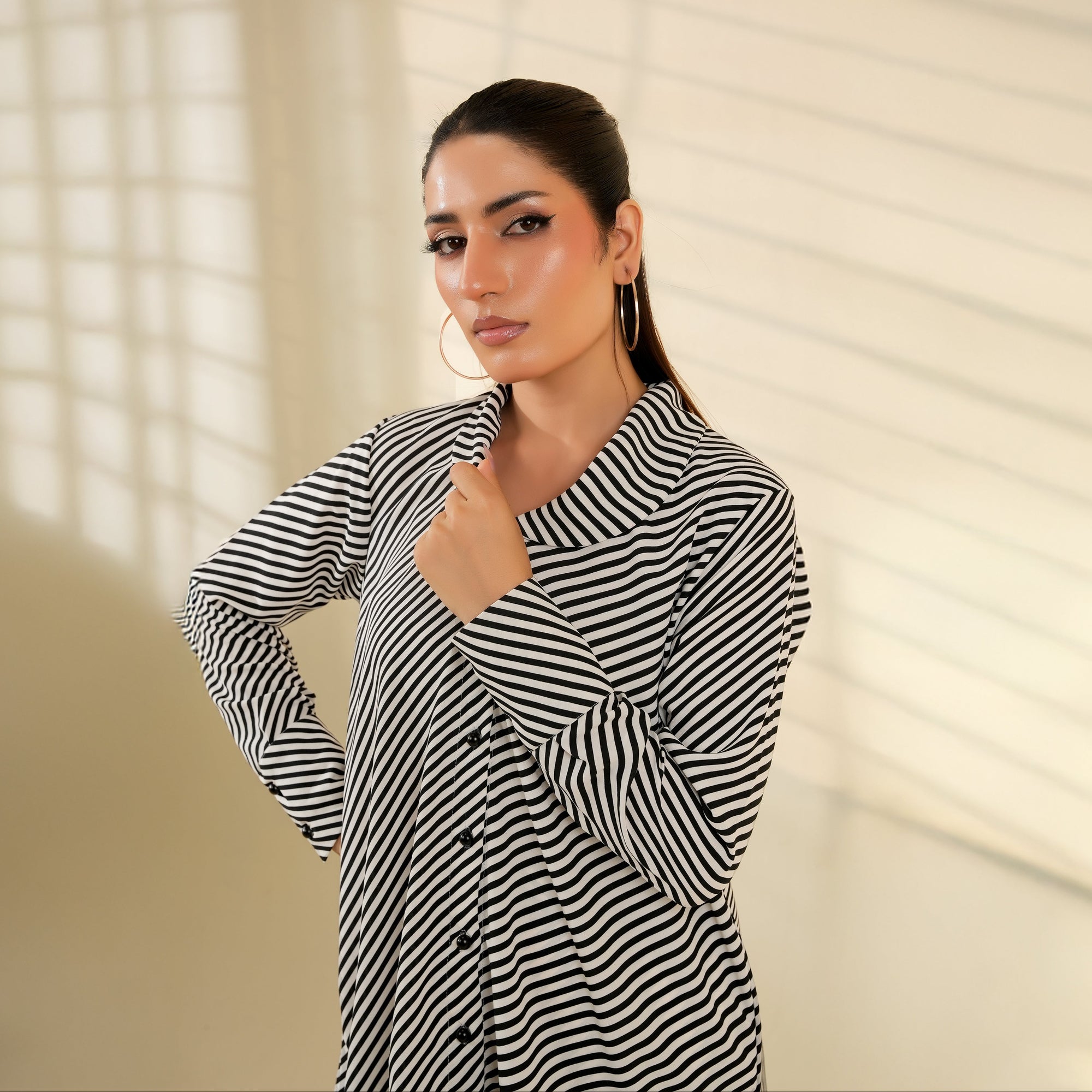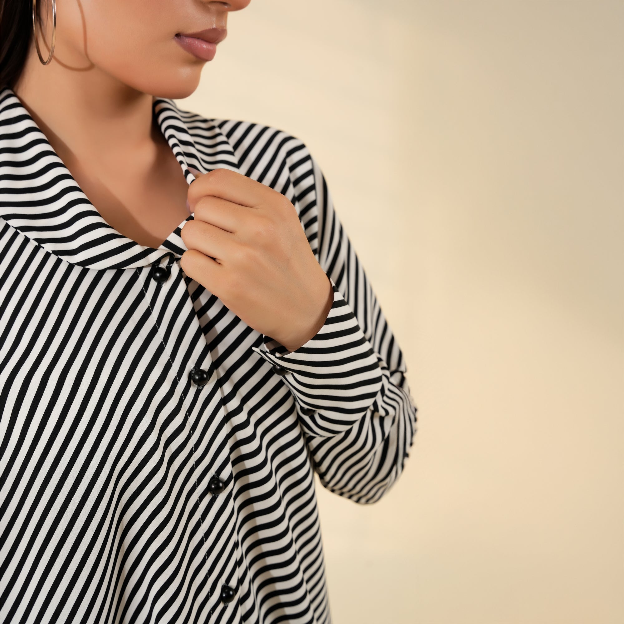 Achieve effortless elegance with this stunning two-piece stripe set. Crafted from lightweight, soft Georgette fabric, it is comfortable and breathable, allowing for a beautiful drape. This suit's bold diagonal stripes offer a contemporary, slimming look, making it versatile.