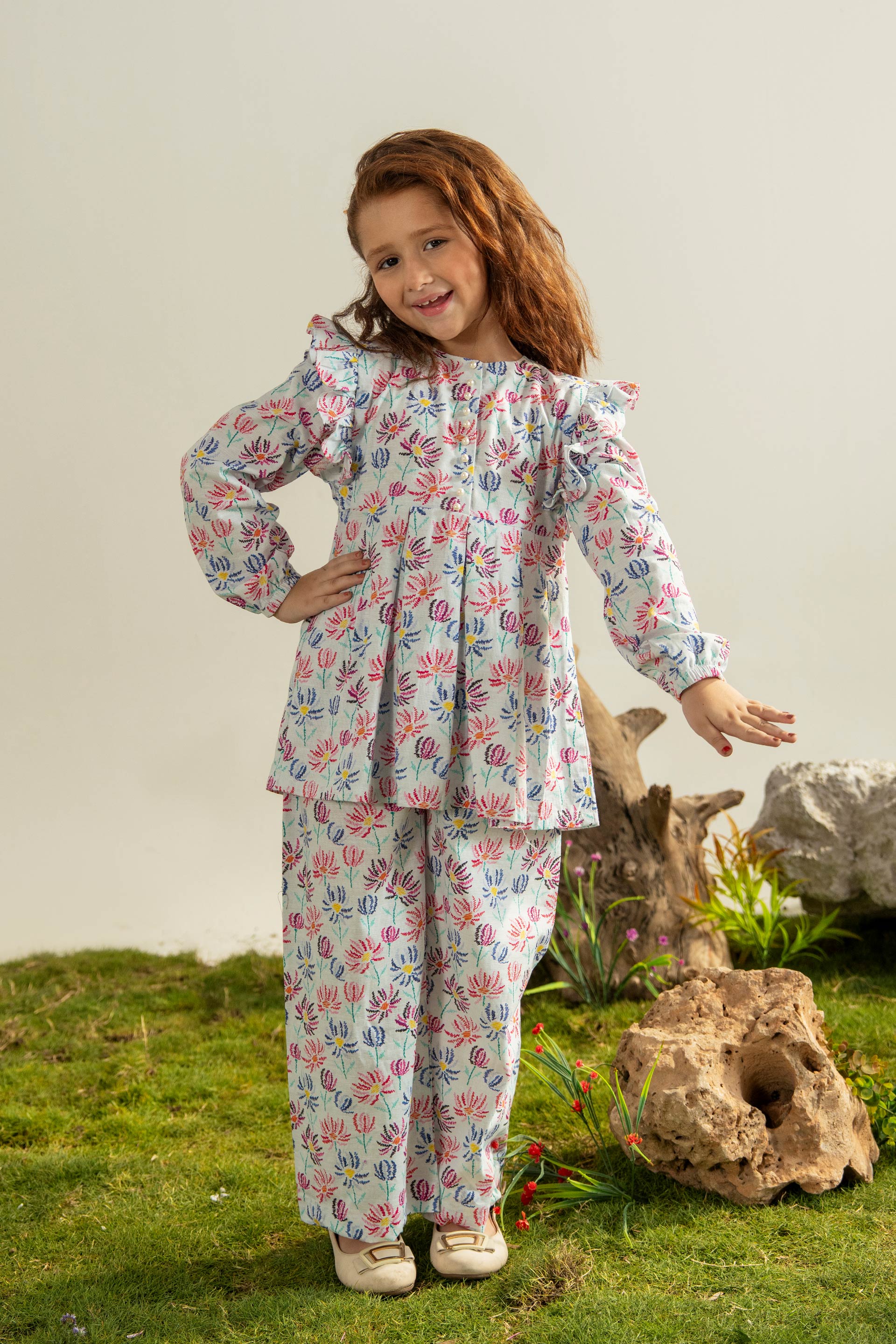 This charming suit, made from light and airy khaddar fabric, features a delicate multi-color print and sweet ruffle detailing on the kurta. A playful yet comfortable look perfect for your little one.