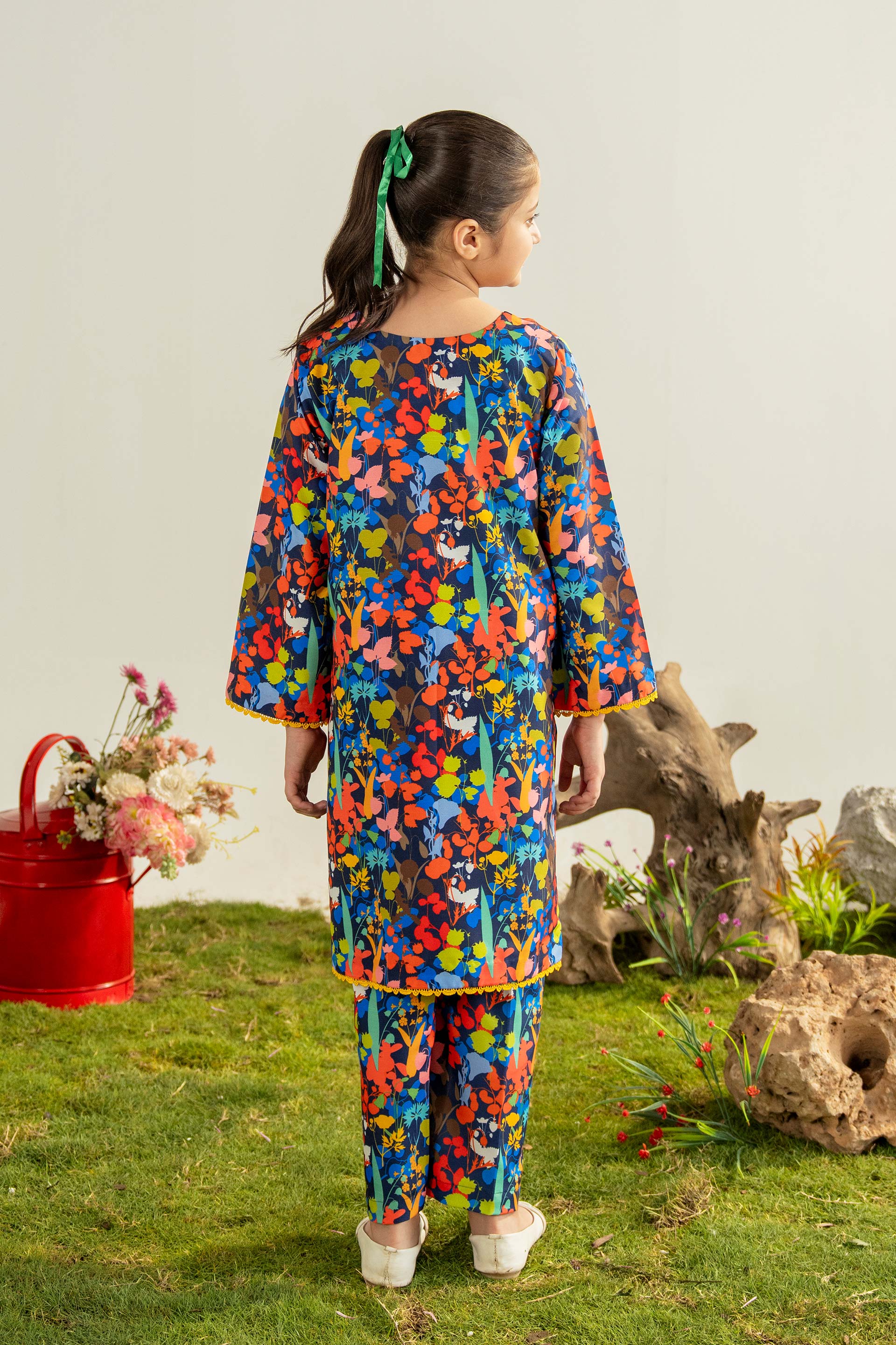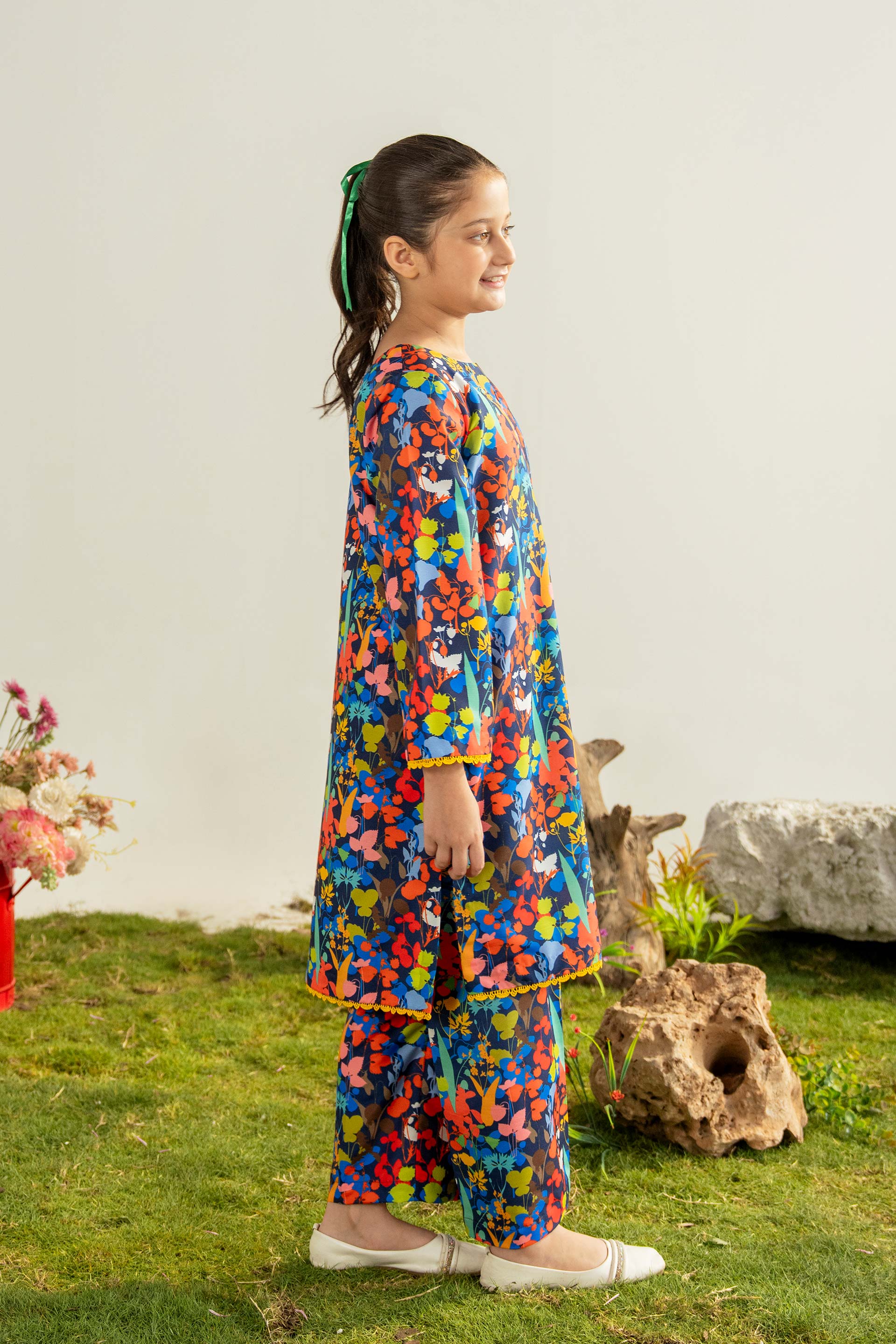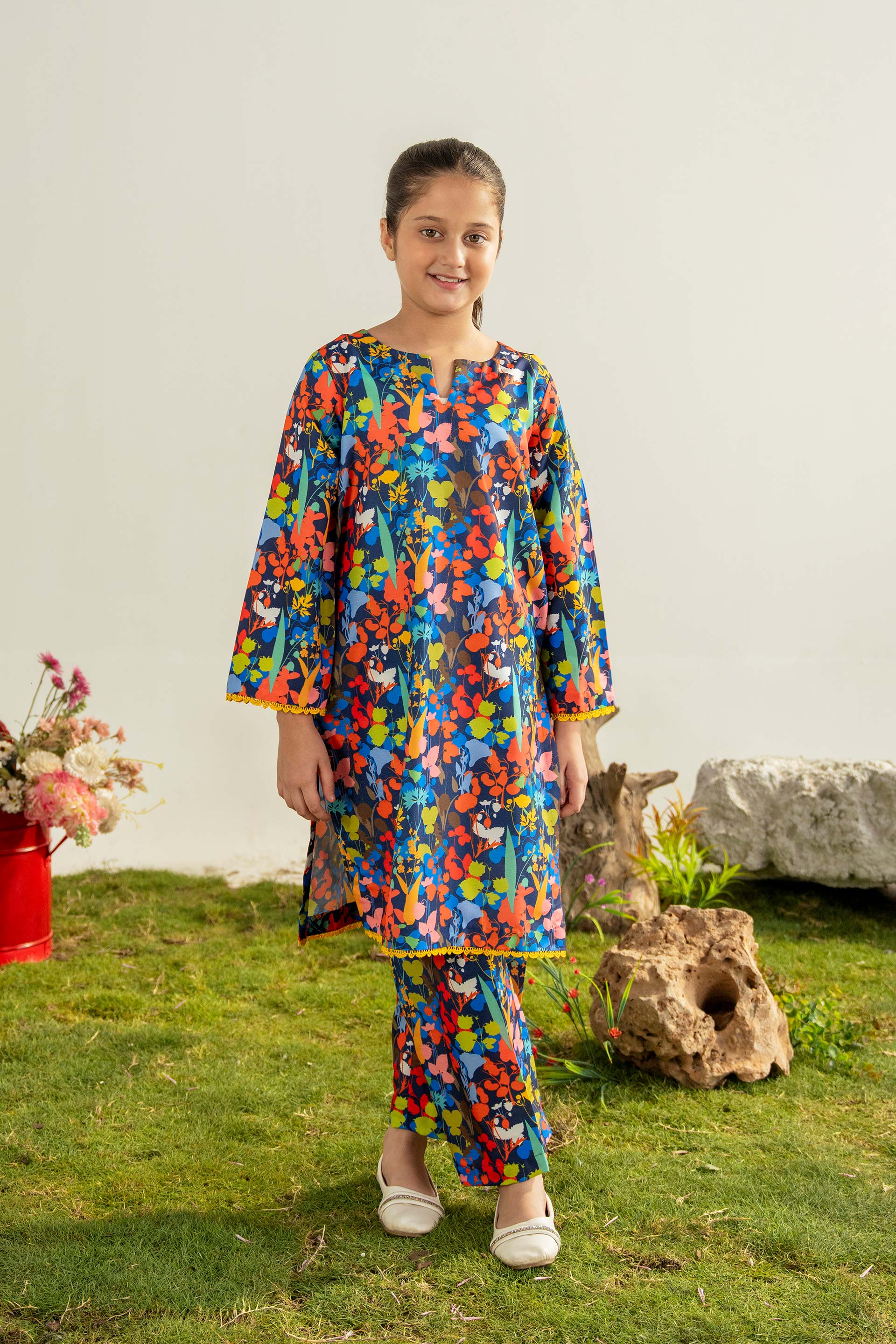 Inspired by a vibrant, secret nocturnal garden, this premium, breathable Raw Silk kurta and trouser set feature a spectacular all-over abstract floral print with cheerful yellow trim, providing a unique, comfortable style for young girls who love to stand out with bold, statement-making patterns.