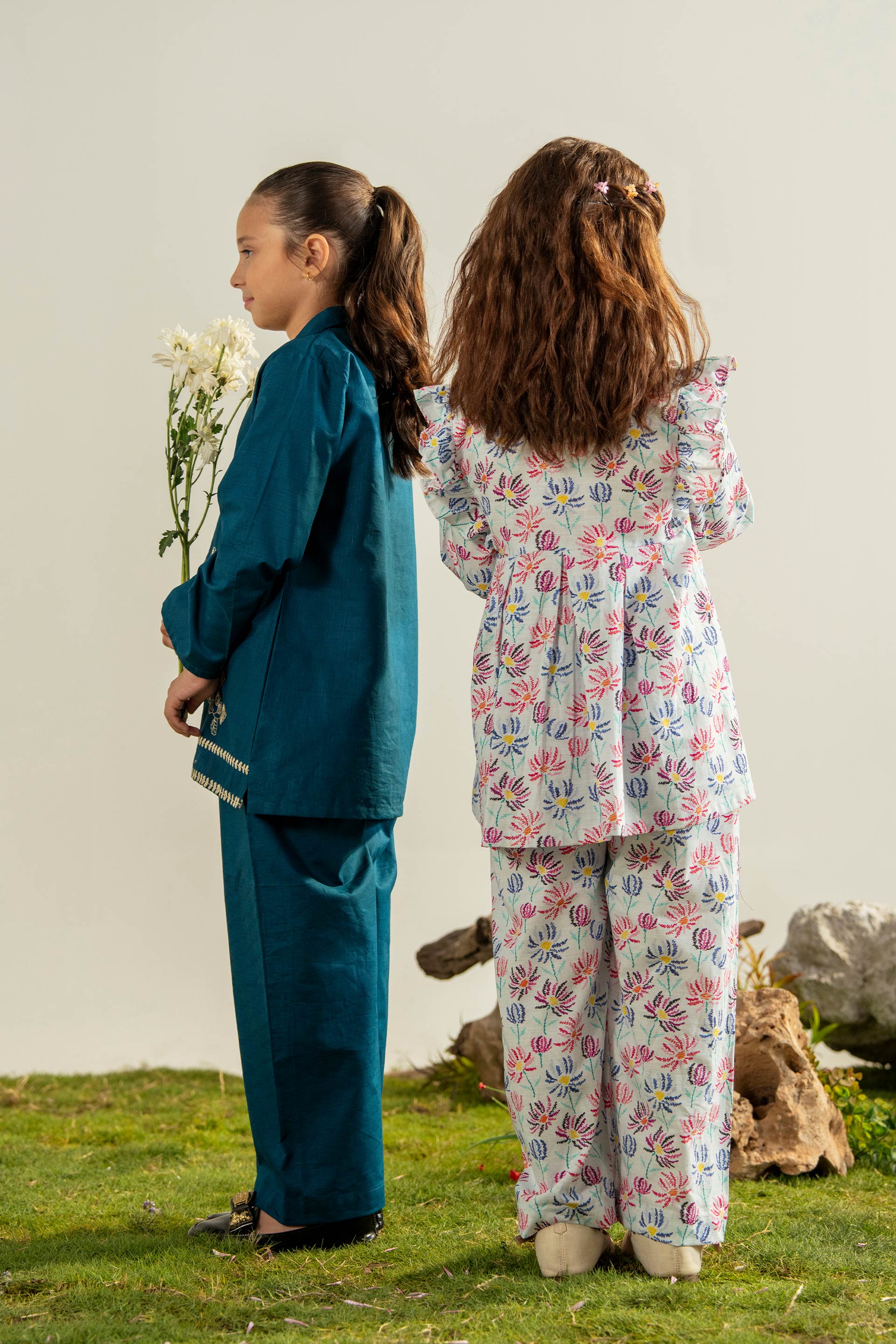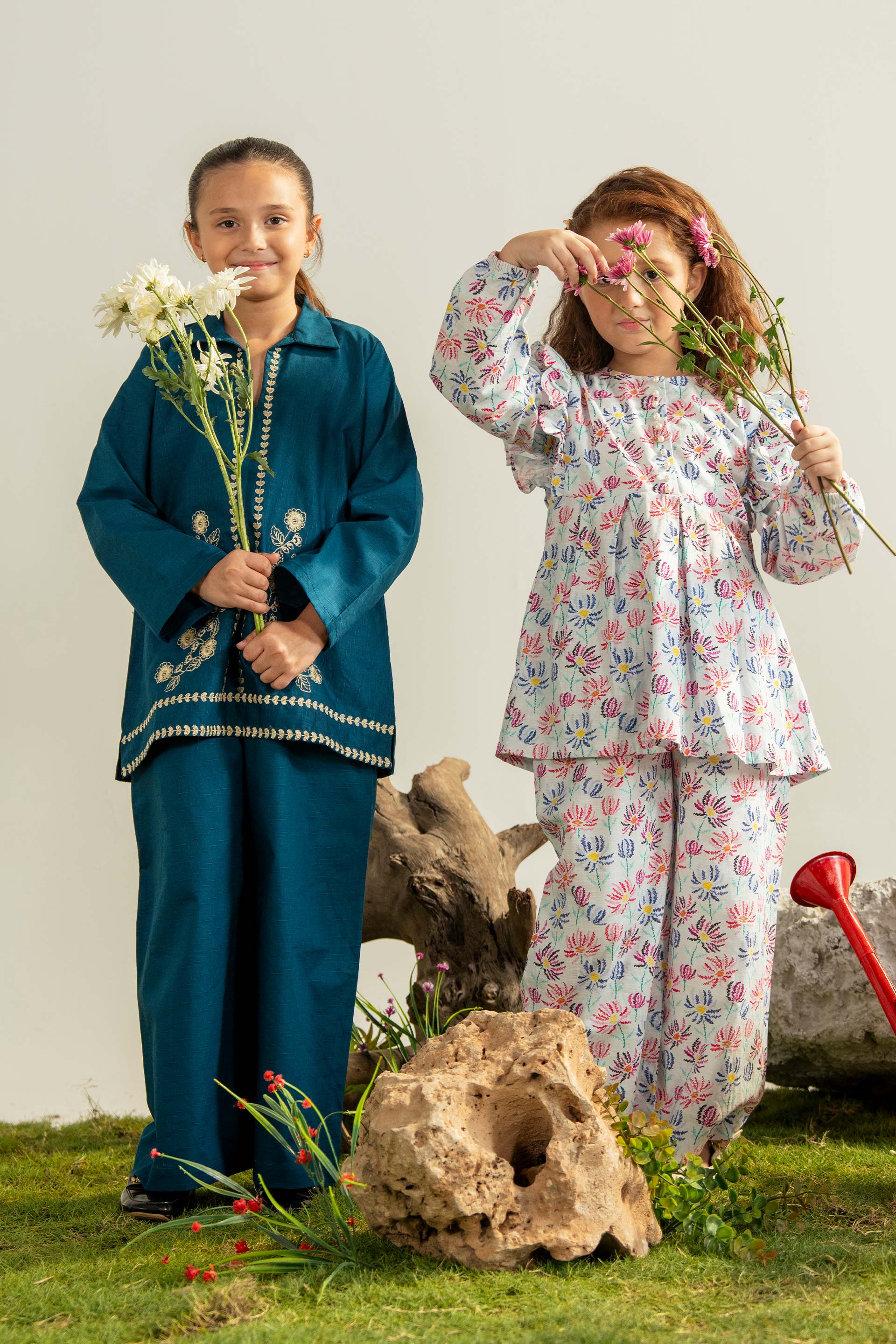 A breathable and comfortable suit in a beautiful deep emerald-blue hue, featuring delicate embroidery near the hem and placket.
