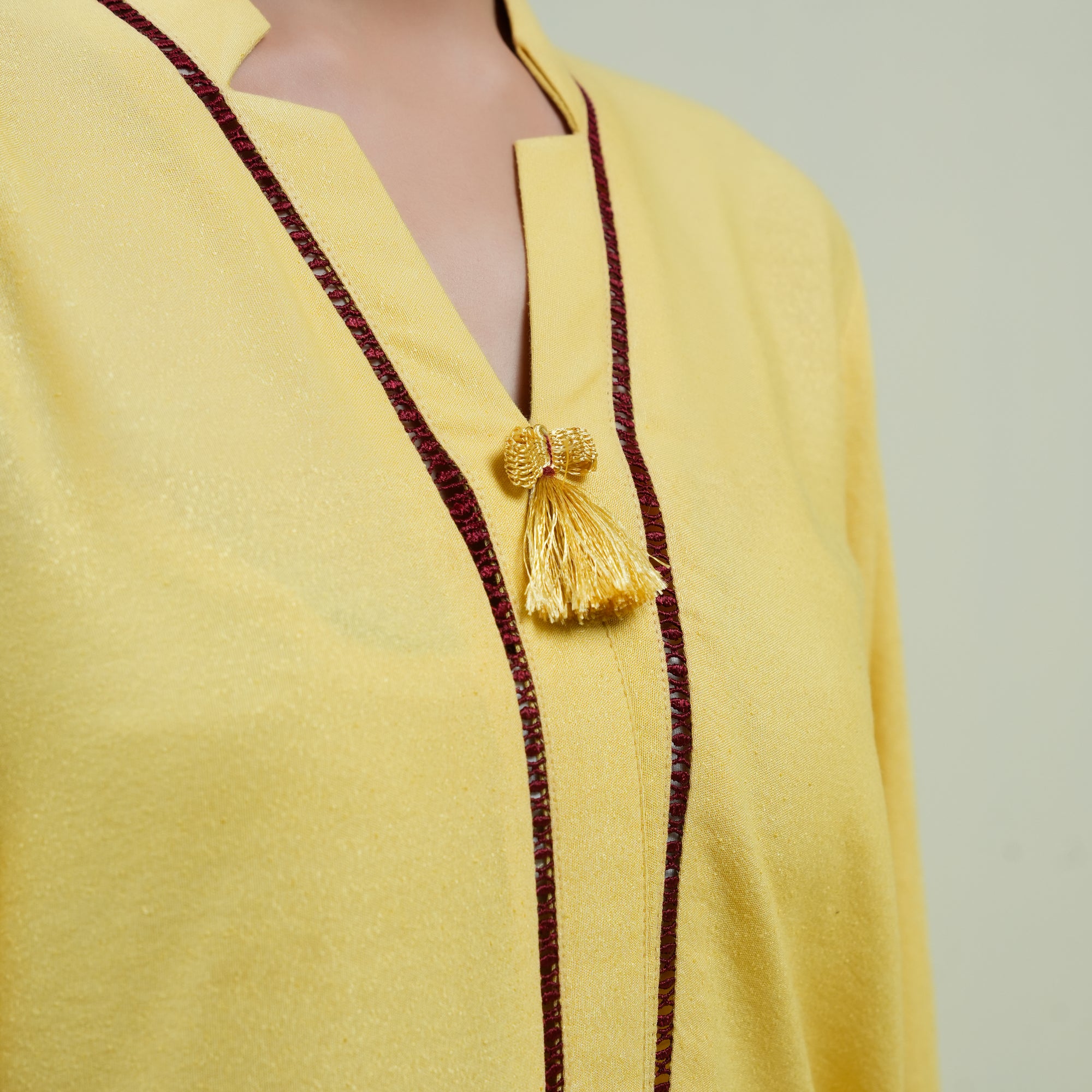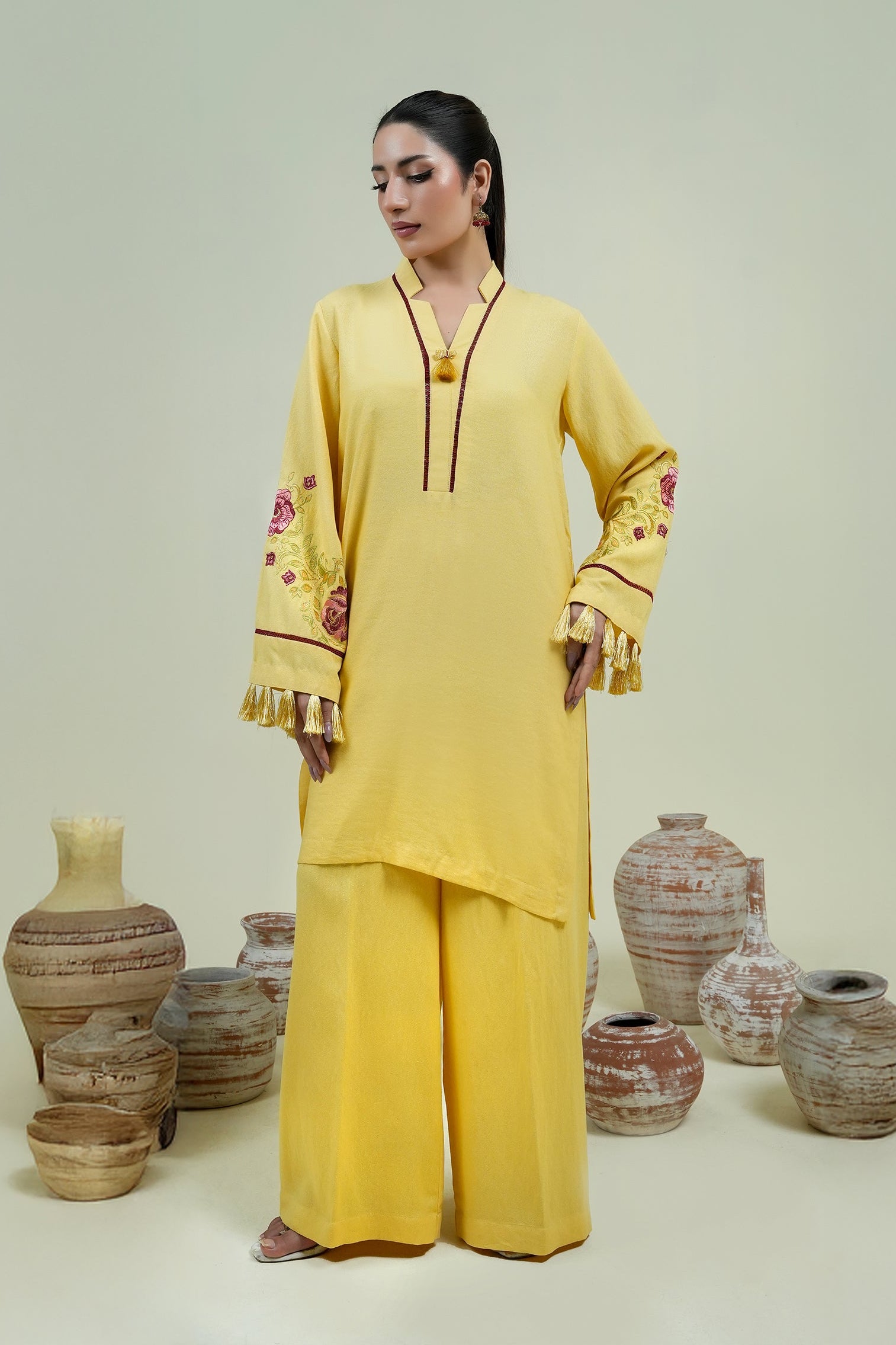 This bright yellow 2-piece features floral embroidery on the sleeves, enhanced with tassel detailing for a trendy touch. Paired with plain trousers in a classic flare cut, it’s the perfect pick for a fresh and elegant look.