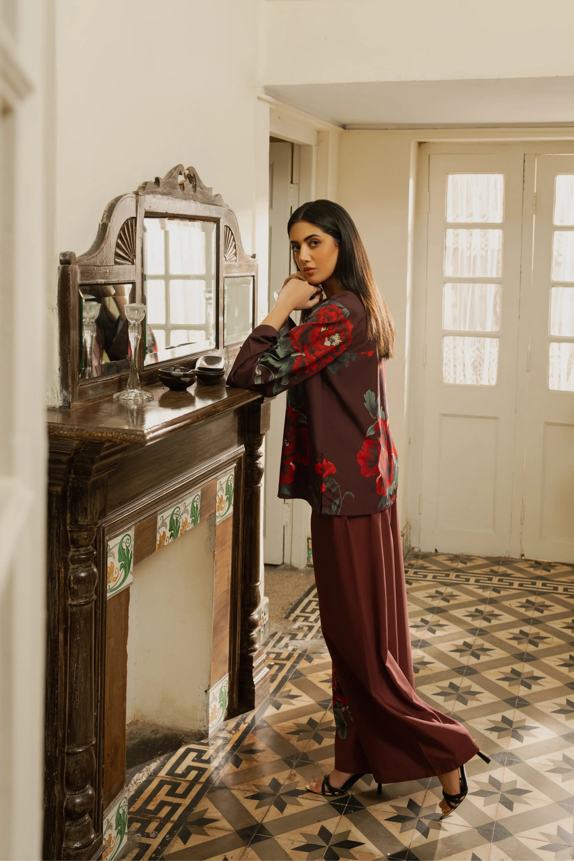 Floral crepe two-piece with a wide neckline, drop shoulders, and free-flowing full sleeves for an effortlessly graceful look.