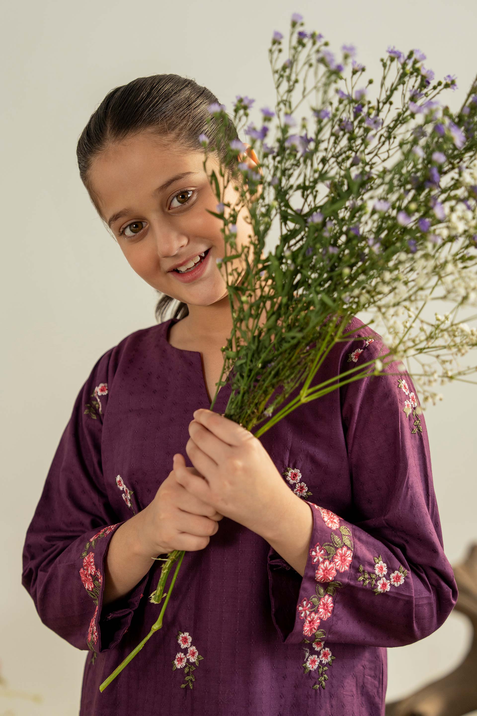This beautiful, deep purple suit features a subtle, textured fabric and delicate pink floral embroidery scattered across the ensemble.