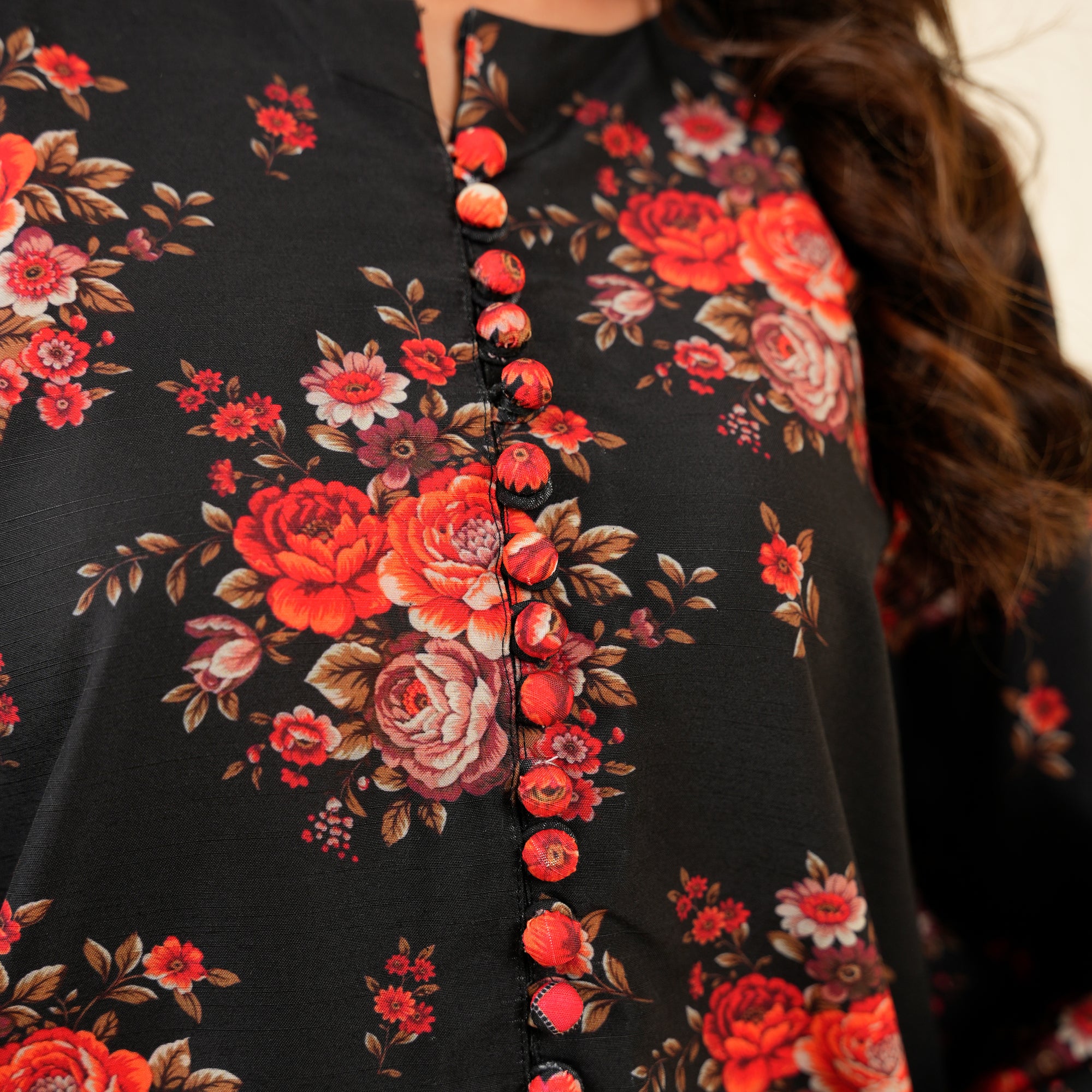 Showcasing a bold floral print 2-Piece inspired by rich, dark heritage textiles and crafted from premium-quality fabric, this stunning black two-piece suit is designed for the confident woman who seeks a striking yet comfortable look for evening gatherings and events.
