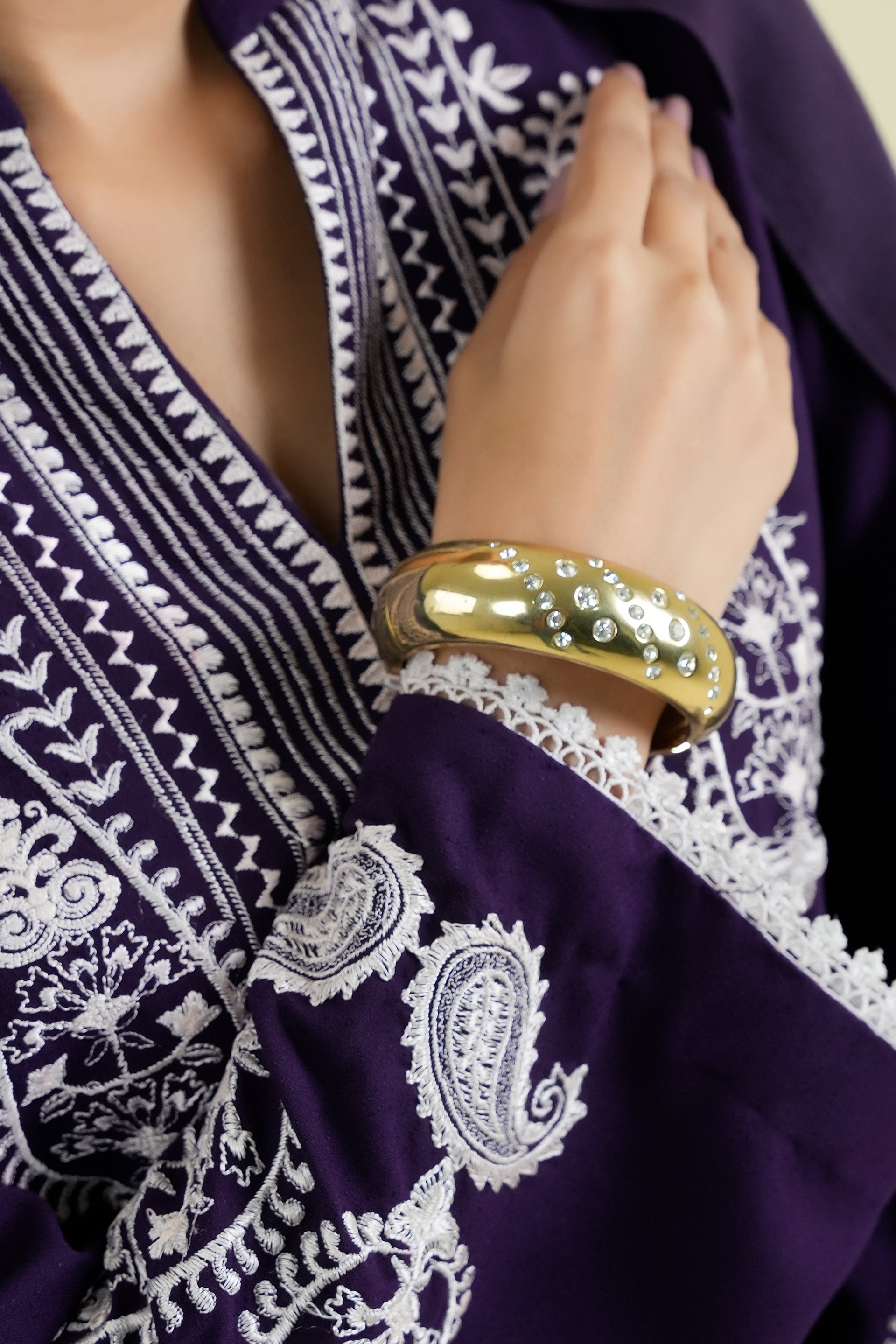 A deep purple 3-piece embroidered ensemble featuring intricate white threadwork and a flowing silhouette that exudes timeless elegance. Perfect for festive or semi-formal occasions with a touch of traditional charm.