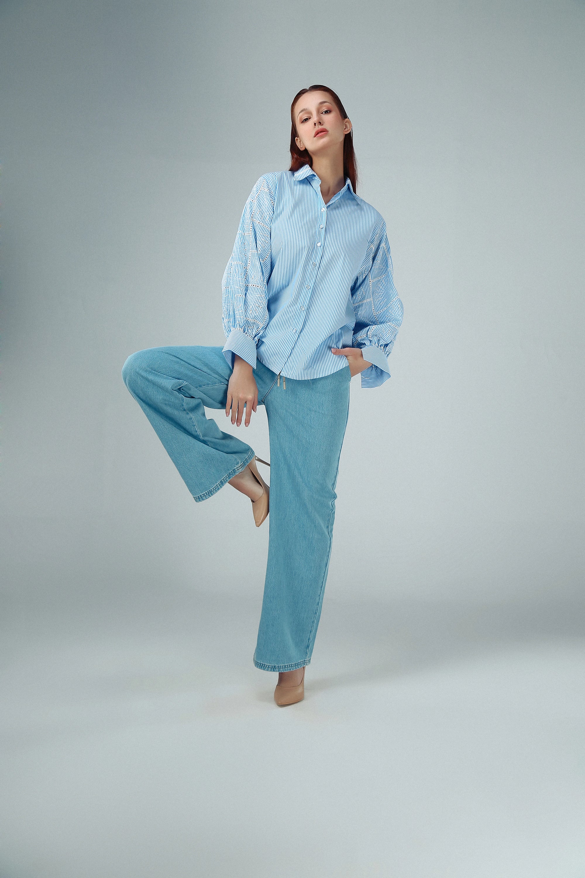 • The Skyline Stripes Shirt features a relaxed, oversized silhouette with fine vertical stripes and voluminous embroidered sleeves, offering a fresh and contemporary twist to everyday wear. Perfectly pairs with denim or tailored bottoms for effortless style.