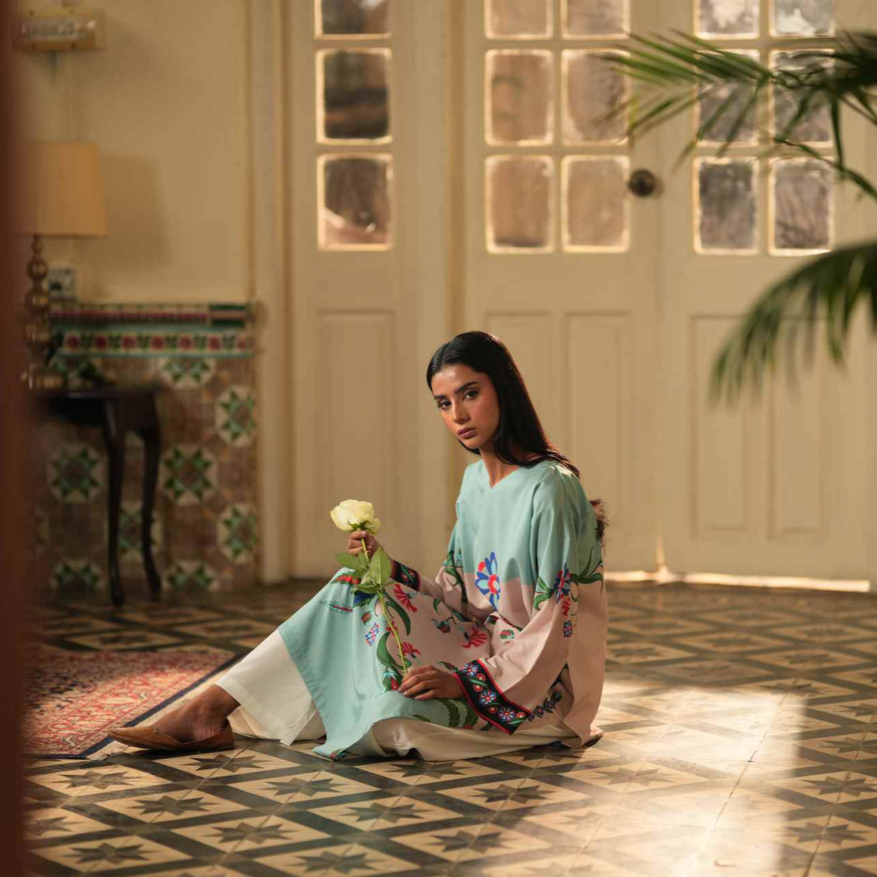 • This tow Piece is made in Crepe Fabric in a floral print. There is a central floral motif on the chest area in red and blue. Elaborate floral vine patterns extend vertically down the front with curved leaf and flower elements in green, red, pink, and blue. The neck is Simple, with no collar and no visible embellishments around the neck, keeping it minimal.